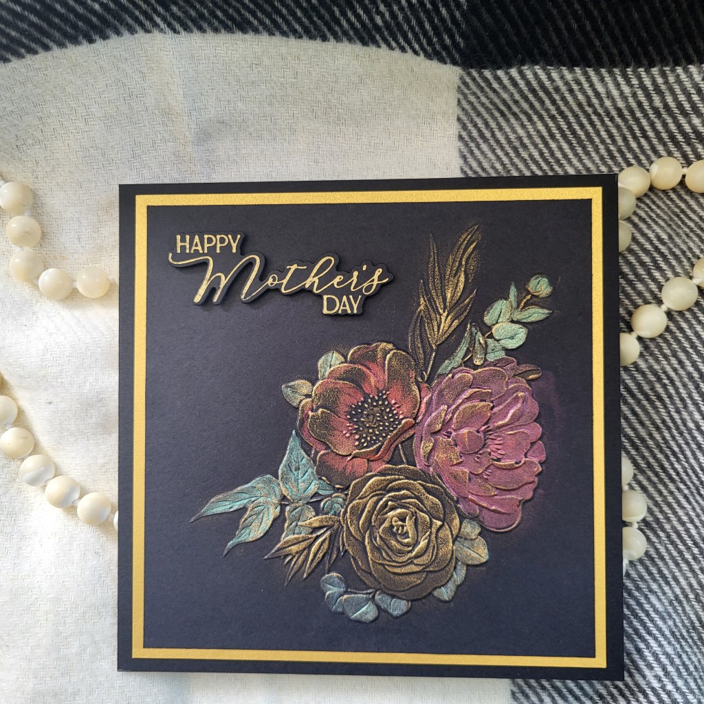 For the first card, I chose the Eclectic Bouquet embossing folder on black cardstock. I then rubbed some Sizzix Luster Wax to highlight the flowers and finished it off with some pearlescent watercolours.