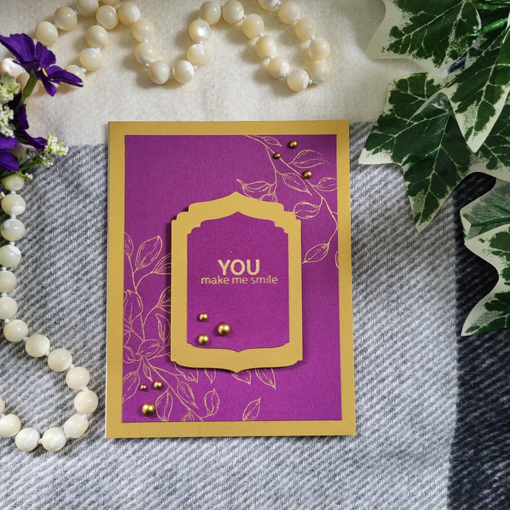 I used the Rustling Leaves press plate with some Tsukineko Dew Drops Brilliance ink in Galaxy Gold on a purplish cardstock. For the sentiment, I used the Ornate Nesting Die set to create a panel, which I popped up with foam tape. The sentiment itself is also from the Rustling Leaves press plate. Mounted on brushed gold card, and finished with some gold half peals.