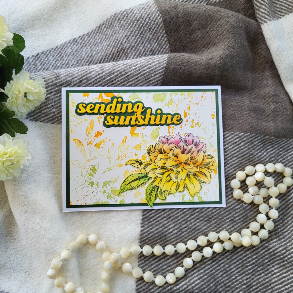 I added a flower from Vintage Garden which I had stamped onto a piece of card that I had already ink blended with various colours. The sentiment is from the Scripty Sentiments die set. I inked some white paper up with Distress Oxide Mustard Seed and die cut the sentiment 3 times and glued them together to get some dimension. The shadow was cut out of the same green cardstock used as the mat for this panel. All of this was mounted on a 5 x 6.5 inch card base.