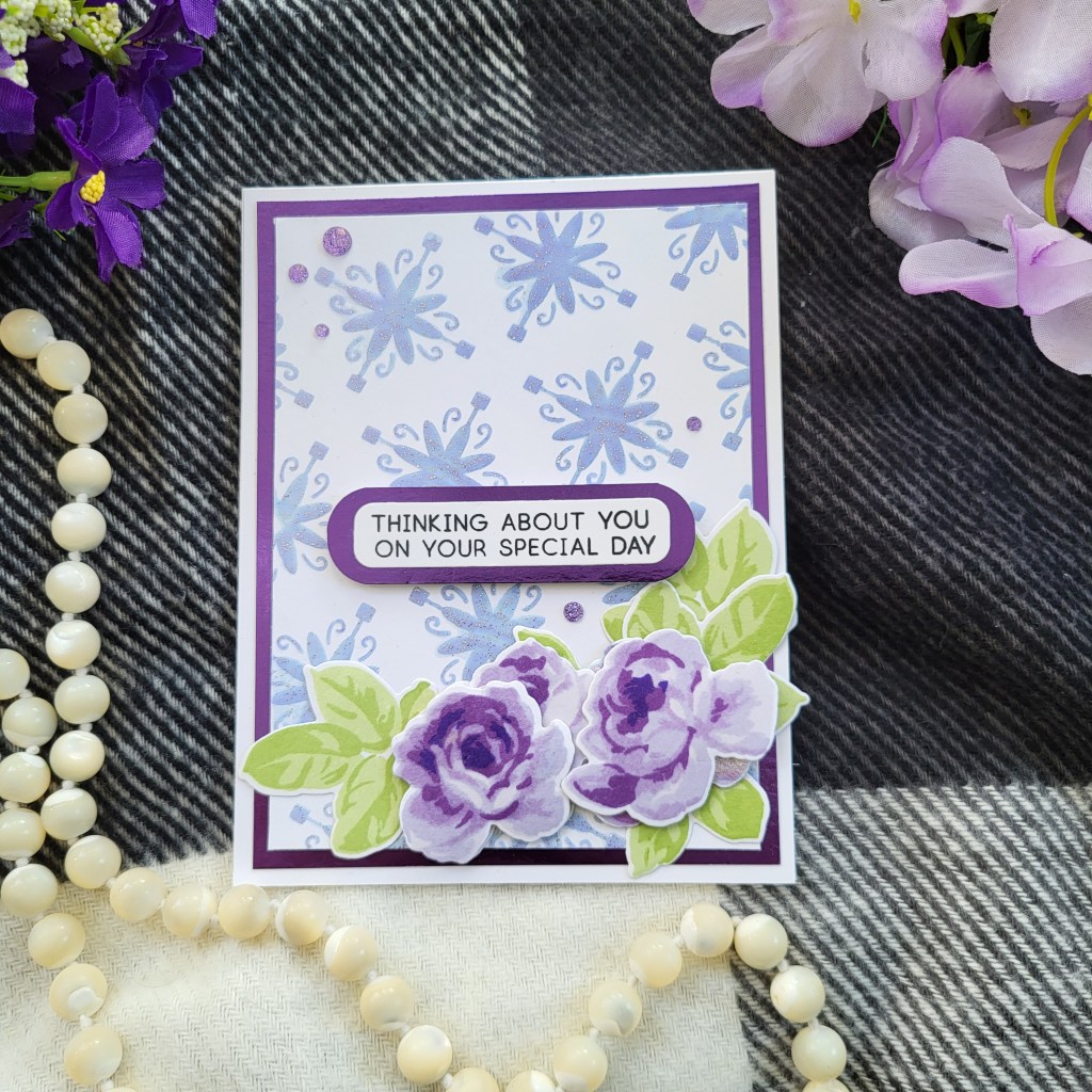 The next technique I used was using a stencil with embossing or texture paste. I chose to use Distress Texture paste Sparkle, which I coloured with Altenew Fresh Ink “Be Grapeful”. I added some flowers from the Ethereal Roses stamp and die set, inked with Soft Lilac, Wisteria, Lavender Fields and Deep Iris. The leaves are Frayed Leaf and Forest Glades. The sentiment for this one comes from the One Go Birthday Greetings set. This is a great sentiment set as you can do up a bunch of them all at once and have them ready to go. The card panel and the sentiment are mounted on purple mirror card and finished off with a few sparkly gems.