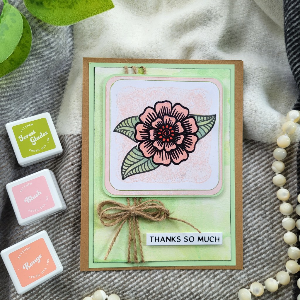 For the top focal layer, I stamped Altenew Fresh Dye Ink – Blush using one of my stamping blocks. I used the Hennah Elements stamp set for the focal point and heat embossed the flower with black embossing powder. I created a mask for the flower and then added the leaves to the design. I did not heat emboss the leaves. I then painted the flower using Altenew Fresh Ink – Rouge and painted the leaves with Forest Glades.